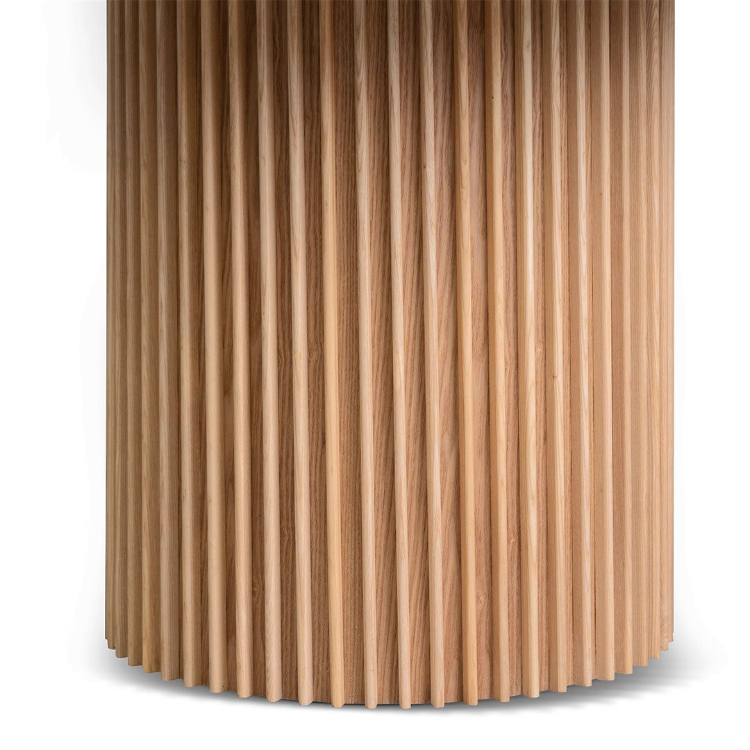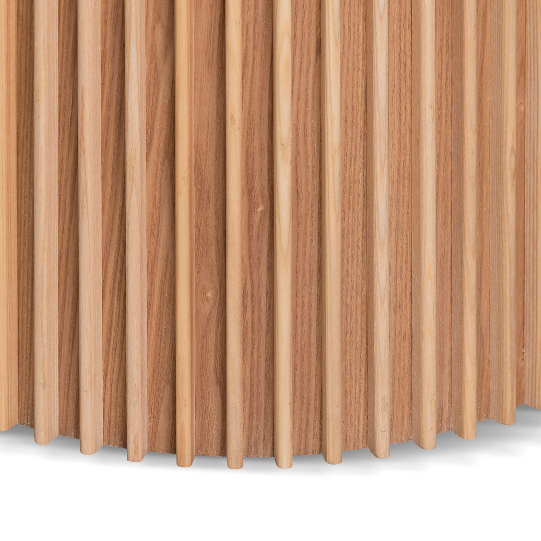 - Round base with solid wood slat pattern
