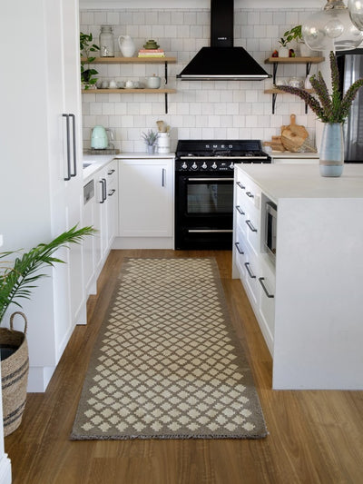 A beautiful hand woven flatweave wool rug, that has been lovingly crafted in Afghanistan.  Natural colour palette to delight any space. Perfect for your hallway or as shown here, in your kitchen.