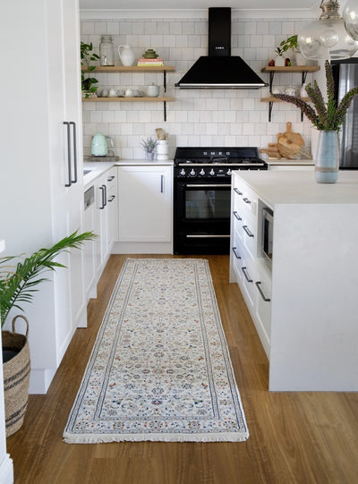 Persian 'Nain' wool, hand knotted by the master craftsmen in Agra, India. Soft muted earthy tones with white base, sure to be a sensation of softness for your feet and mesmerising as the light dances upon it.