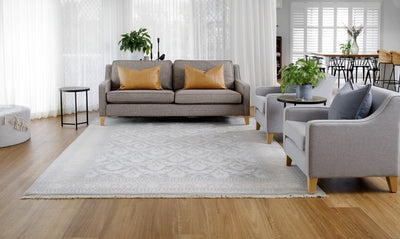 Hand crafted in Varanasi, India, this is one of our most luxurious rugs in its simplicity. Made of soft wool which has been hand knotted, the soft grey and ivory hues and delicate pattern are sure to impress.